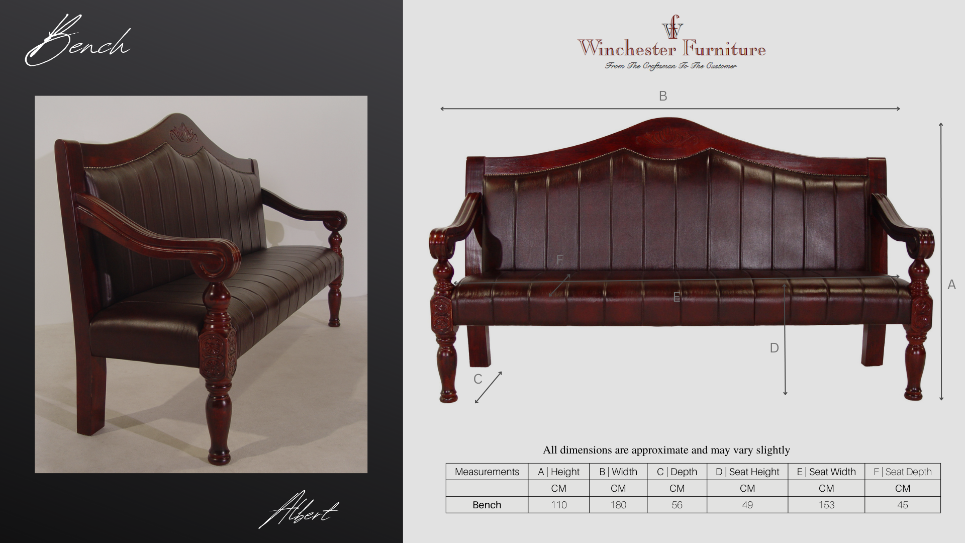 The Albert Seat Bench is a beautiful piece of furniture crafted from solid beech wood and stained with a rich mahogany colour. The graceful front legs are intricately carved for a timeless look. Upholstered in our top grain leather, this bench is an elegant addition to any room. Its sturdy construction makes it ideal for seating in a hallway or entryway. Add the Albert Bench to your Winchester Furniture collection today.